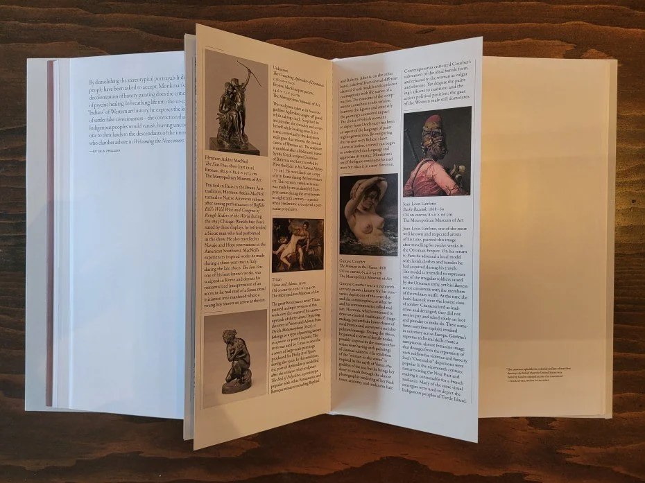 Monkman began the work with a careful tour of the Metropolitan Museum’s vast collection, selecting several works from the Western art historical canon as inspiration for his reimagining of history. The book does a thorough job of illustrating how these sources were used to inform Monkman’s vision. The sources are covered both in the essays and two sets of inserts, as seen below.