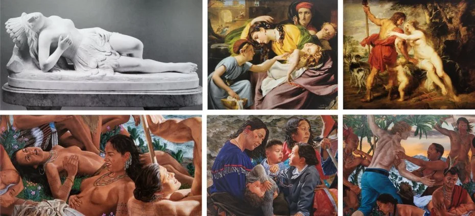 TOP: The original sources of Western art. Left, Mexican Girl Dying, by Thomas Crawford, 1846; middle, Massacre of the Innocents, by Francois Joseph Navez, 1824; right, Venus and Adonis, Peter Paul Rubens, 1630s. BELOW: how these sources are reinterpreted in mistikôsiwak.